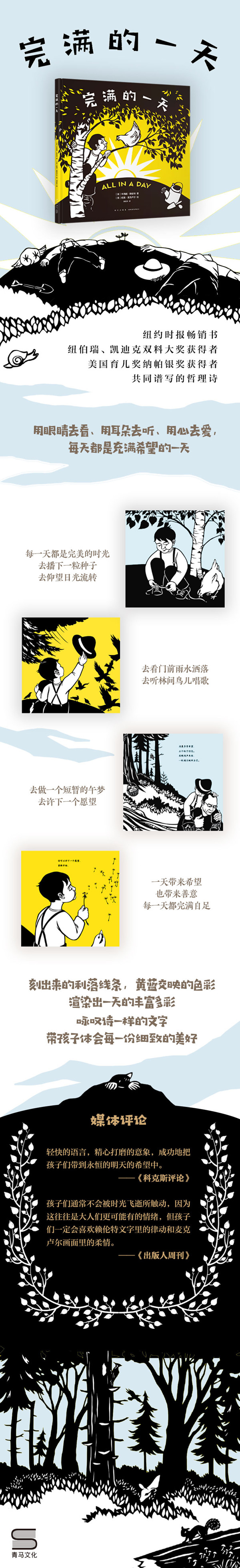 纽约时报畅销书 纽伯瑞、凯迪克双料大奖获得者,美国育儿奖纳帕银奖获得者,共同谱写的哲理诗 用眼睛去看、去耳朵去听、用心去爱,每天都是充满希望的一天 刻出来的利落线条,黄蓝交映的色彩,渲染出一天的丰富多彩 咏叹诗一样的文字,带孩子体会每一份细致的美好