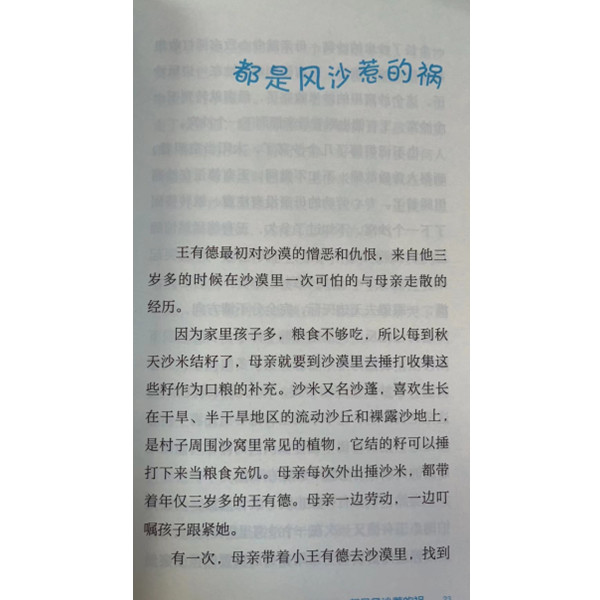 王有德从小生长在沙漠边。沙漠就像一个大沙怪,破坏了村庄和农田,让百姓吃不上饭,也让十八岁的王有德被迫离开了家乡。 为了让百姓过上好日子,打败大沙怪,三十二岁的王有德带着一身本领回到了沙漠,担任防沙林场场长。为了保证树苗成活率,当天运来的树苗,无论多晚,王有德都带领工人把它们栽完,经常顶着星星连夜干活。他用了几十年时间,和工人一起在沙漠中筑起“绿色长城”,让大沙怪向东退后二十多公里,保护了万顷良田。 王有德用“魔法”把沙漠变成绿洲,还用“魔法”把贫穷变成富有。他建柳编厂,造果园,办建材厂,成立苗木公司,让娇贵的南方苗木在沙漠中安了家,将沙漠变成了聚宝盆,让人们过上了幸福的生活。