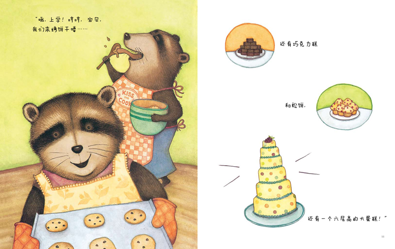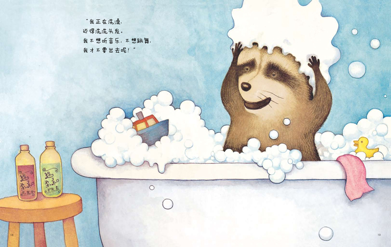 谢天谢地,白天玩累了的小赛莉竟然主动提出要上床睡觉,对于平常总会找借口拖延上床的孩子来说,这可真是难得的“自觉”啊!一般的父母肯定会喜出望外、欣然应允,但浣熊爸妈竟然回答说“不行”,而且不知怎地忽然摇身一变,变成了两个难缠的“老顽童”,兴趣盎然地提议孩子继续玩。即使几次三番遭到赛莉的拒绝,他们依然百折不挠,并且花样百出:一会儿说要烤香喷喷的饼干蛋糕,一会儿说要去玩玩具、做游戏,一会儿又建议听听音乐跳跳舞。直至赛莉上了床,他们仍旧玩兴不减,主动提出要给她讲四个故事,想出各种点子去阻挠她睡觉,甚至趴到床底下去看看是否藏着怪物??哈哈哈,这些顽皮的行为分明是在模仿小赛莉平时的举止啊!那得意的神情、那稚拙的动作让人捧腹,这对返老还童的父母真是可爱至极!