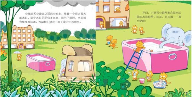 《拔河大战•数字和数量》:小象家与小猫家中间有个大大的水缸,两家为了争水缸要进行拔河比赛,小象只有一个人,而小猫家有好多好多小伙伴,20只小猫终于能跟小象打成平手,借由这个故事教孩子如何数数。