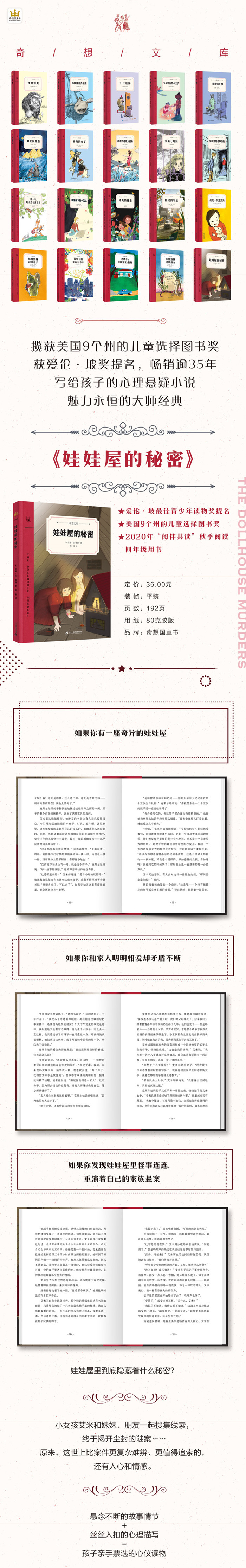 在曾祖父母阁楼里,小女孩艾米无意间发现了姑妈少女时代的一座娃娃屋。从娃娃屋里,不时传出抓挠声和小跑声;里面玩偶们所在的位置也总是悄悄变化……是玩偶们试图告诉她什么吗?他们的移动,和曾祖父母遭遇的那起悬案有关吗? 艾米和妹妹露安以及朋友埃伦一起寻找线索,终于揭开了多年前的谜案……原来,这世上比案件更复杂难辨、更值得追索的,还有人心和情感。书中对艾米与父母、妹妹和挚友之间关系的描写,给这个扣人心弦的悬疑推理故事增添了一抹温暖明亮的色彩。