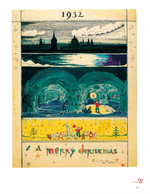 每年十二月,托尔金家的孩子们会收到一个盖着北极邮戳的信封。信封里装着圣诞老爸写给孩子们的信,以及画给他们的画。每一封信都是圣诞老爸用冻得抖抖抖的手亲手写下画下的。孩子们超爱圣诞老爸在信里讲的故事——他在北极老家的朋友、房子,以及许多或滑稽或奇妙的事儿:驯鹿把缰绳扯断了,搞得礼物四散到处都是;爱唱反调的北极熊爬上了北极柱,却从圣诞老人的房顶摔进了他的客厅;北极熊还把月亮摔成了四瓣儿,让住在里面的人掉到了后花园里;还有他们与住在圣诞老爸屋底洞穴里的半兽人部落之间的“战争”……北极熊偶尔会潦草地留个便条,精灵伊尔贝斯有时也会用他优雅飘逸的笔迹写上一些北极生活的细节。