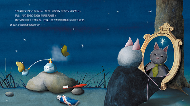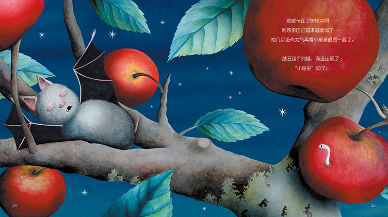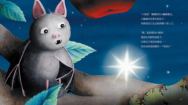 一只小蝙蝠爱上了一颗遥远的小星星。但是,该怎么接近小星星呢?小蝙蝠想了好多办法,比如写诗、画画,打扮自己,甚至用“苦肉计”,但都失败了。小蝙蝠向小星星飞去,却累得从空中掉了下来,卡在了树杈中间。但就在这个时候,“奇迹”出现了……