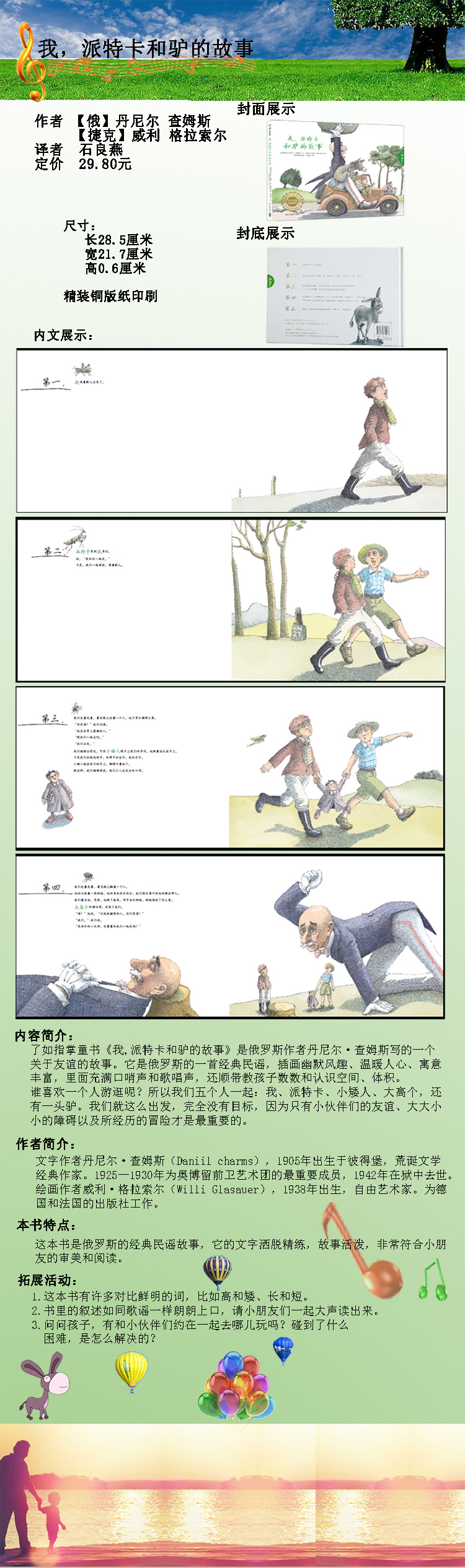 是丹尼尔·查姆斯写的一个关于友谊的故事。它感动人心、稀奇古怪,里面充满口哨声和歌唱声,还顺带教孩子数数和认识空间、体积。谁喜欢一个人游逛呢?所以我们五个人一起:我、派特卡、小矮人、大高个,还有一头驴。我们就这么出发,完全没有目标,因为只有小伙伴们的友谊、大大小小的障碍以及所经历的冒险才是最重要的。