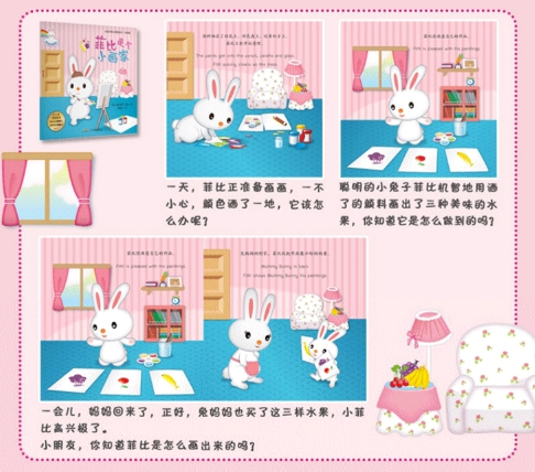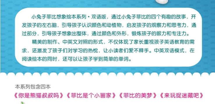 小兔子菲比想象绘本系列,帮助宝宝想象力提升、辨别颜色,激发宝宝想象力,培养宝宝观察力。精美的制作、中英文对照的形式,不仅体现了家长重视孩子英语教育的需求,还激发了孩子们对学习的热忱,让小读者们爱不释手。中英双语模式,在阅读绘本的同时,还可以让孩子学到简单的单词。