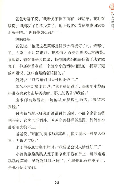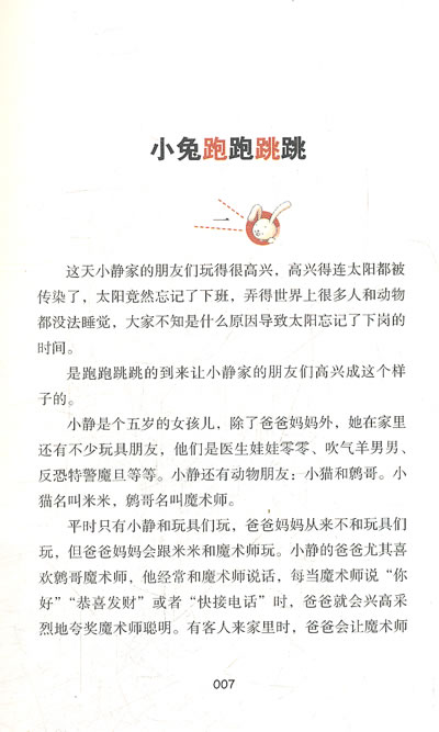 一只宠物小兔来到了小静家,它马上和其他玩具们成了好朋友。可是快乐的日子并不长久,前任宠物小兔的命运向它敲响了警钟。小兔怎样才能摆脱被宰割的命运?出逃、绝食……通通不行。玩具们为此了制订一个大胆的计划…… 《小兔跑跑跳跳》是“郑渊洁七彩童话”系列之一。《小兔跑跑跳跳》收录了《作业调整公司》;《老鼠转笑刀》等故事。