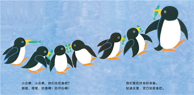 小兔子嘴里嚼着胡萝卜,在吃早餐呢。长颈鹿学着妈妈的样子吃树叶呢!吧唧吧唧,吧唧吧唧。小企鹅好机灵啊!钻进水里,吃了一条又一条鱼。大白熊横叼着一条鱼。大白熊好大啊!鱼也好大啊!河马母子俩大口大口吃着堆积如山的青草,吃那么快,吃那么多,青草一定很好吃吧。