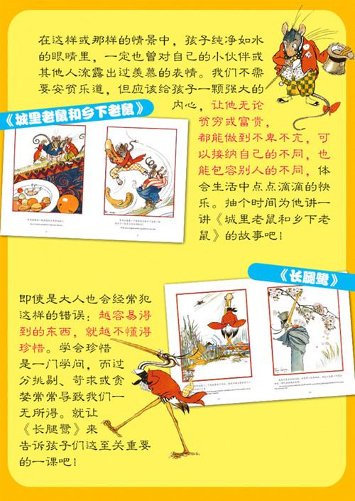 在这样或那样的情景中,孩子纯净如水的眼睛里,一定也曾对自己的小伙伴或其他人流露出过羡慕的表情。我们不需要安贫乐道,但应该给孩子一颗强大的内心,让他无论贫穷或富贵,都能做到不卑不亢,可以接纳自己的不同,也能包容别人的不同,体会生活中点点滴滴的快乐。抽个时间为他讲一讲《城里老鼠和乡下老鼠》的故事吧! 即使是大人也会经常犯这样的错误:越容易得到的东西,就越不懂得珍惜。学会珍惜是一门学问,而过分挑剔、苛求或贪婪常常导致我们一无所得。就让《长腿鹭》来告诉孩子们这至关重要的一课吧!