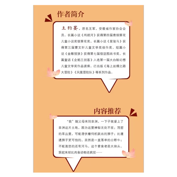 “我”随父母来到非洲,一下子就爱上了这片土地,因为这里神秘无处不在:茂密的草丛里,可能潜伏着世纪月初的狮子;比遭遇诗词更可怕的是,竟然是一只落单的公野牛;千万不能激怒河马'这个大块头虽然是素食动物,但是狠起来比肉食猛兽还疯狂。