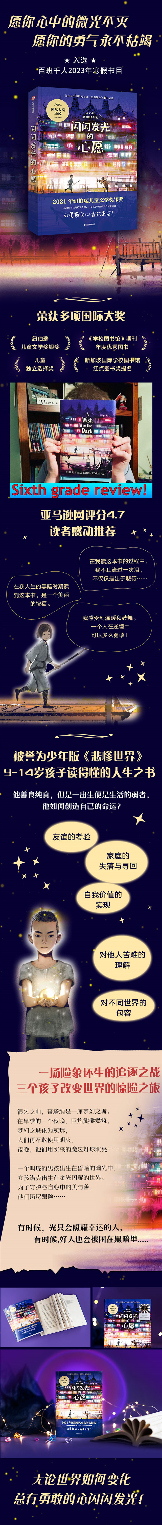 ★ 荣获2021年纽伯瑞儿童文学奖银奖、《学校图书馆》期刊年度优秀图书、儿童独立选择奖、新加坡国际学校图书馆红点图书奖提名。 ★ 被誉为 “少年版《悲惨世界》”。现实主义与浪漫色彩结合的经典文学手法,史诗般的故事结构,生动的人物群像描写,有助于提升孩子的文学鉴赏能力。 ★ 一场险象环生的追逐之战,三个孩子改变世界的惊险之旅。情节曲折,充满奇遇,带孩子在故事中体验一次与命运和逆境勇敢对抗的大冒险。 ★ 9-14岁孩子能够领悟的人生之书。将如何维护正义、守护人性光辉的主旨与孩子的成长之旅结合,包含了关于友谊的考验、家庭的失落与寻回、对自我的认知、对他人的同理心等主题。