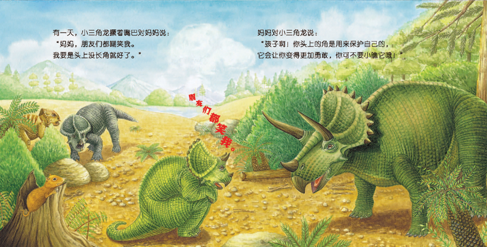 有一只小三角龙,跟妈妈一起在森林附近的河边生活。他们与其他友好善良的恐龙们一起玩耍,和睦相处。有一天,小三角龙撅着嘴巴对妈妈说:“妈妈,朋友们都嘲笑我。我要是头上没长角就好了。”妈妈对小三角龙说:“孩子啊!你头上的角是用来保护自己的,它会让你变得更加勇敢,你可不要小瞧它哦!”这时凶恶的食肉恐龙——霸王龙出现了。……
