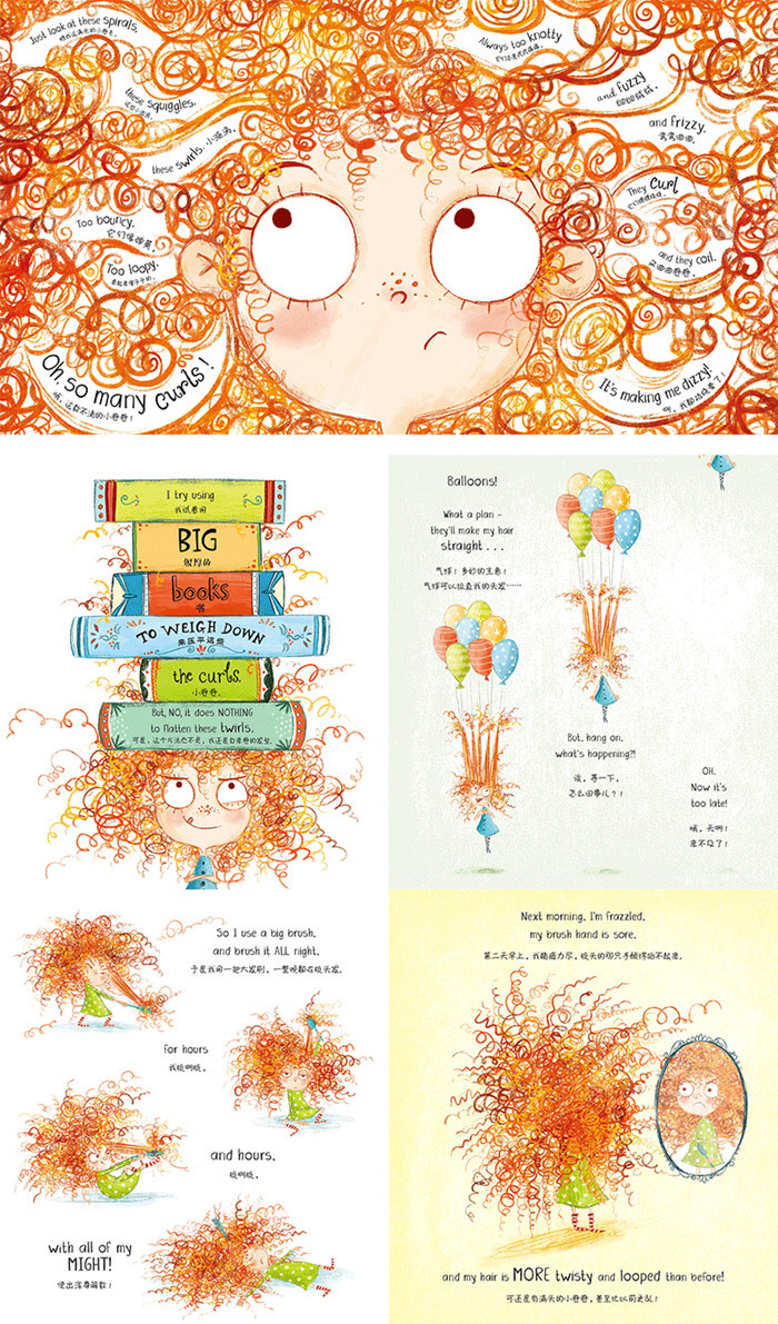 每个人都有着不同的烦恼,有的烦恼很大,有的烦恼很小,而有的烦恼却很卷。有一个卷发小女孩,她并不喜欢自己那一头又卷又蓬的卷发。她觉得老天爷很不公平,为什么别人能拥有那么顺滑的直发,而自己连梳头都需要好几个小时。她尝试了很多方法,试图让自己的头发变直,但都以失败告终。有一天,当她又在为卷发苦恼的时候,碰到了一个正在抱怨自己头发很无趣的直发小女孩。两个小女孩相视一笑,原来自己的头发并没有那么糟糕,于是她们用各自的头发变出了各种有趣的造型,*后,她们都爱上了自己的头发。