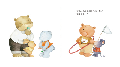 爸爸给多多买了好吃的糖。多多把糖果分给了小朋友,跟好朋友一起分享,多多觉得这些糖更甜了。
