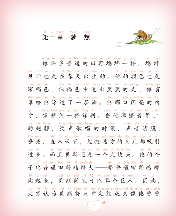 《梦想号游船》是“爱的礼物”大奖作家新童话中的一种,是两次荣获全国优秀儿童文学奖的著名作家汤素兰为广大小读者奉献的新作。“爱的礼物”定位于“将人类美好情感代代相传”,每个故事对应着一种美好情感。《梦想号游船》对应的情感关键词是“追随梦想”。 在蟋蟀家族里,每只年轻的蟋蟀都希望成为威武的角斗士,但是蟋蟀贝斯却只想成为一名快乐的歌唱家。终于,贝斯克服重重困难,毅然离开了家,顺着小溪流淌的方向开始了自己的旅程。他在旅途中结识了不打不相识的青蛙王子,两人组成合唱团,为沿途的动物们放声歌唱,还与重病缠身离家出走的家蛇菜花、美丽善良的蛇医蓝豆娘结下了深厚的友谊,他用自己的行动激励着大家一起找寻心中的梦想,从庸常的生活中解脱出来,为获得心灵的自由世界而努力。然而,美好的日子总是那么短暂,冬天降临了,当贝斯终于实现了梦想并回到最初出发的地方,他的生命却也走到了终点。但也正因为生命有限度,梦想才值得追寻,不是吗?