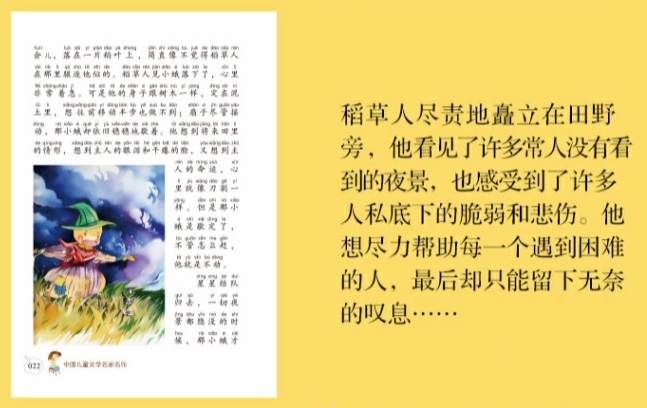《稻草人》是中国现代首本为儿童而写的童话集,以其中的一篇《稻草人》为全集的名称。《稻草人》这一童话集子收录了中国现代童话创作的拓荒者叶圣陶的一些童话名篇。这些故事用充满诗意的童话意境、用代表性的情景和人物、生动的故事、优美的语言,为广大儿童创造了生动活泼的童真世界, 而且在浅显的故事中潜藏着深刻的含义,于平实的语言中传递着强烈的感情。带领我们一起走进童话世界,了解劳动人民的苦难,认识淳朴善良的“傻子”、富有同情心而又无能为力的稻草人、聪明勇敢的野牛……