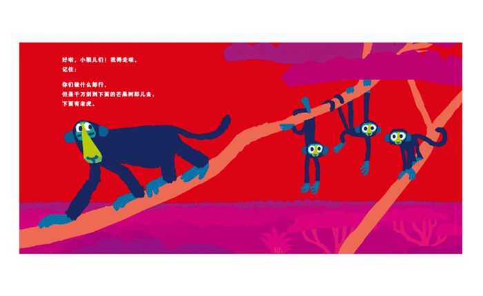 一天,大猴子要外出,她叮嘱三只小猴子:“一定不要爬下树,不要靠近那棵芒果树哟!那里有老虎。” 等她离开后,三只小猴子抑制不住自己的好奇心,开始往下爬,伸手够到了一个芒果吃,等吃到芒果,三只小猴子又商量着:“太好吃了,要是能再摘一个就好了。”他们继续往下爬,终于,坐到了芒果堆里,尽情吃芒果。突然,异样的声音传来,是老虎,快跑!三只猴子终能逃脱老虎的追赶吗?接下来它们还会有怎样的历险?