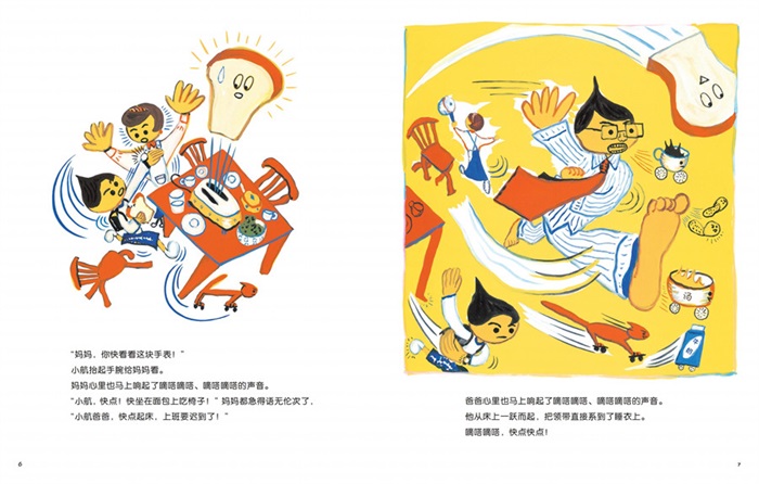 小航在杂物间找到了一块旧手表。手表越走越快,小航的心里也滴答滴答地响了起来,动作越来越快,飞快地起床、上学。小航的爸爸妈妈、邻居、街上的人,学校里的老师和同学、坐飞机、坐轮船的人,心里都滴答滴答地响了起来,干什么都加快了速度。