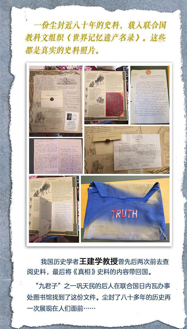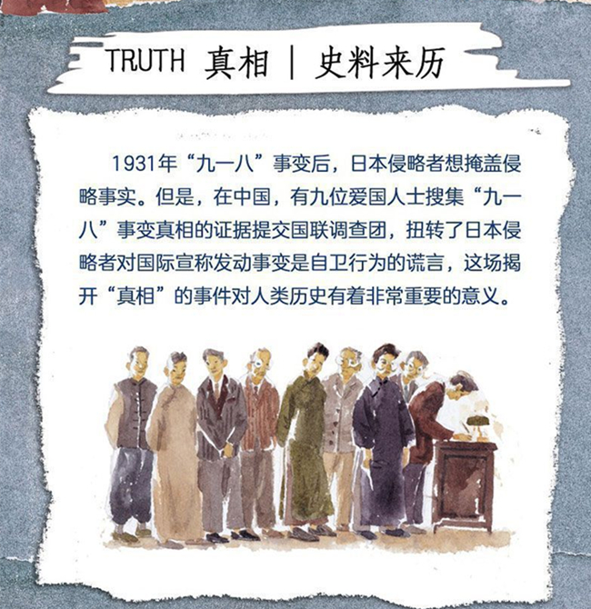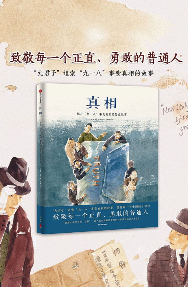 这个故事是面向4-8岁孩子的历史绘本。故事的历史史料现藏于联合国日内瓦图书馆,我国著名历史学家王建学教授先后两次到日内瓦,查阅并将《真相》史料的图片带回了中国。这个故事完整再现了1931年中国“九君子”向国联递交日军发动九一八事变的真实证据的事件过程,扭转了日本侵略者对国际宣称发动事变是自卫行为的谎言,这场揭开“真相”的事件对人类历史有着非常重要的意义。《真相》史料的搜集、整理、递交的过程中,中国人民、英国人民、爱尔兰人民联合捍卫了人类正义,才使这段历史被以正视。
