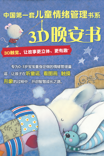 本书延续了情绪管理书系的一贯风格,通过可爱的毛毛兔形象,表现了多个情绪管理的主题。其独特之处在于内容采用了童谣的表现形式,极富韵律的话语使本书读来朗朗上口,更契合晚安书的特质和0-3岁幼儿的认知能力。3D立体效果也是本书一大亮点,孩子能够在视觉、听觉、触觉三方面的刺激下,体会阅读的乐趣。此外,磨圆角、采用环保而有相当厚度的纸板,也是根据低幼年龄段孩子的特征所作的特别设计。