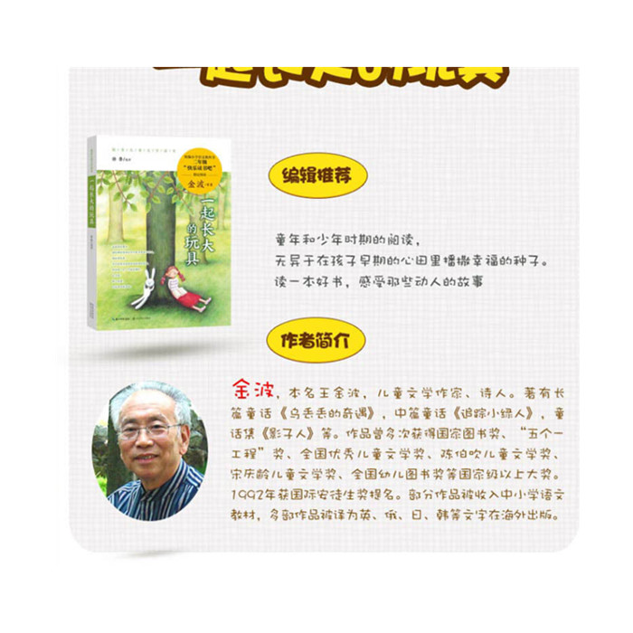 《一起长大的玩具》是一本优秀的儿童文学作品,是岁月送给孩子的珍贵礼物。精选了金波,徐鲁等优秀儿童文学作家的作品,话题触及人生、人性和成长等话题,以优秀的文字,来带给孩子们心灵成长的力量。其中《一起长大的玩具》(金波/著)是统编教材小学语文“快乐读书吧”指定阅读篇目。图书配以精美的插图和暖心的点评文字,点评文字雅洁纯正,启迪智慧,字里行间充溢着一种亲近阅读、直达文心的中正平和之气