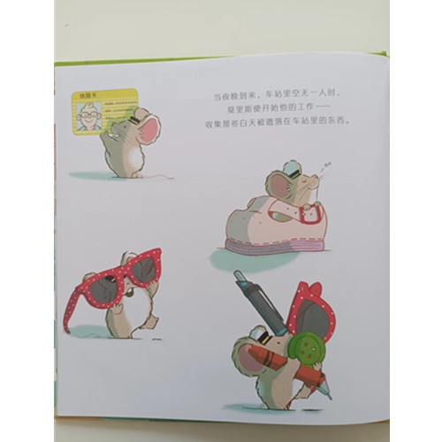 作者用清新的颜色、可爱的形象,以及一幅幅满藏着细节的画面,用心地为孩子们构建出一个立体的绘本世界。密密麻麻做好标注的火车站地图,各种样式的失物标签,莫里斯房间里的招贴画、广告和信件,还有一本本书籍……这些细节充满生活气息,但并不是为了展示作者的耐心或精细的画功, 而是为了使角色更立体,使画面呈现的世界更真实。