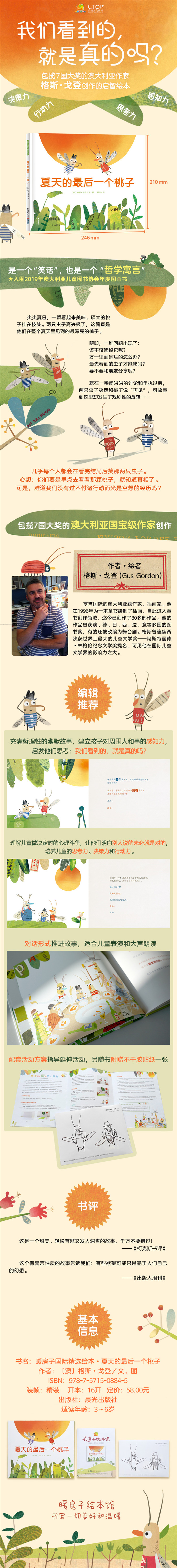 炎炎夏日,一颗看起来美味、硕大的桃子挂在枝头。两只虫子高兴极了,这简直是他们在整个夏天里见到的*漂亮的桃子。随即,一堆问题出现了:该不该吃掉它呢?万一里面是烂的怎么办?*先看到的虫子才能吃吗?要不要和朋友分享呢?就在一番闹哄哄的讨论和争执过后,两只虫子决定和桃子说“再见”,可故事到这里却发生了戏剧性的反转……