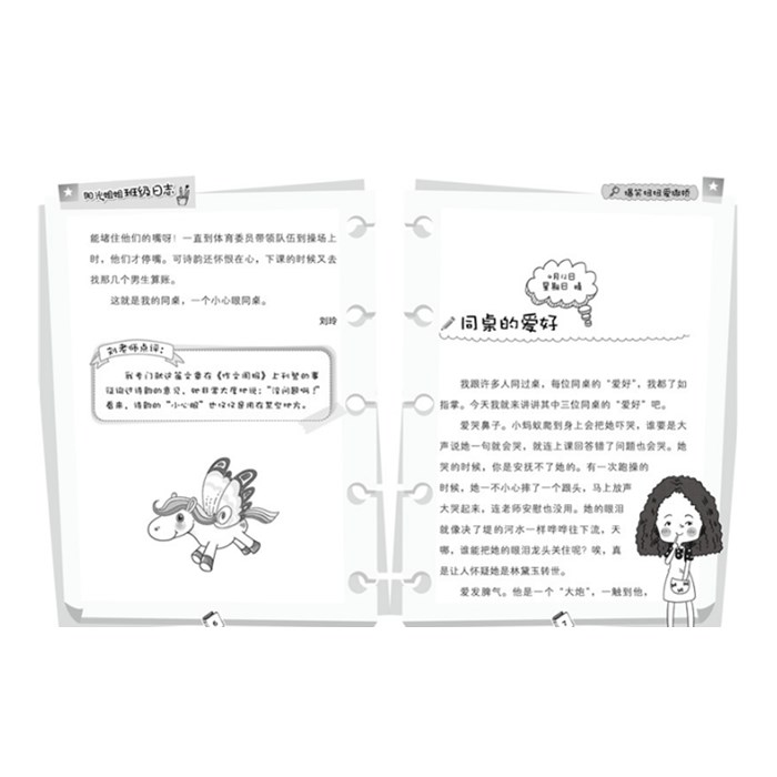 《爆笑妞妞爱撒娇》我们班的同学既可爱又有个性,有人爱哭爱笑,有人性格乖巧,有人乐于助人,有人才华横溢,和他们在一起,永远都不会觉得无趣。看,为了大家午餐吃得更好,同学们敢“勇闯”校长办公室;为了让学习更有效率,老师和同学一起制定了特殊班规;为了让生病的同学快点好起来,伙伴们一起写了温暖的信。还有写生课、剪纸课、足球赛、游园会、跳蚤市场……这些好玩的活动让我们的校园生活丰富多彩,和老师同学在一起的时光,有太多太多的瞬间值得珍藏。