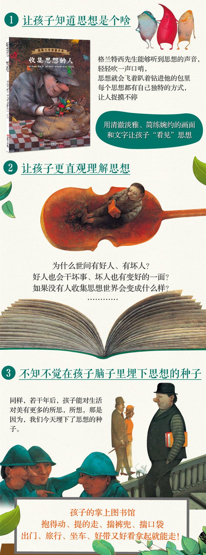 格兰特西先生的工作是收集各种思想无论好的,还是坏的;聪明的,还是愚蠢的;躁动的,还是平静的;长的,还是短的。 尽管他自己也有自己最喜欢的思想,但却从不放弃别的思想。因为所有的思想都十分敏感,所以他要处处都顾及到,让所有的思想都不会受到伤害。