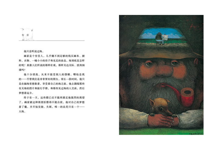 从前有位画家,在城市里生活了很久很久。他几乎已经画过了所有的东西。比如:房屋、树木和大街,人、汽车、动物、小商店和街边咖啡馆,战争纪念碑和垃圾桶。城市里再也没有什么可画的了。画家越来越老,胡子变得稀疏而花白。他思索着:现在该画什么了呢?他只是听说过海……