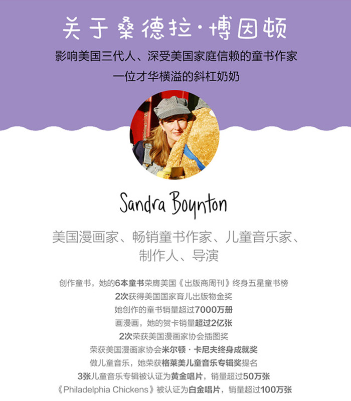 桑德拉•博因顿(Sandra Boynton),桑德拉•博因顿是美国畅销童书作家、儿童音乐人、导演、漫画家,她的6本童书荣膺美国《出版商周刊》终身五星童书榜,2本书获得美国国家育儿出版物金奖,2次获得美国漫画家协会图书类、贺卡类插图奖,荣获美国漫画家协会米尔顿•卡尼夫终身成就奖,音乐专辑《Philadelphia Chickens》获得格莱美最佳儿童音乐专辑奖提名……在语言艺术和绘画、音乐上极有天赋的博因顿:做音乐,她的3张儿童音乐专辑被认证为黄金唱片,销量超过50万张,《Philadelphia Chickens》被认证为白金唱片,销量超过100万张;做艺术设计,她的贺卡销量超过2亿张;创作童书,她的童书销量超过6000万册。她创作的童书给美国三代家庭带去了欢乐,成为人们信赖的童书作家。