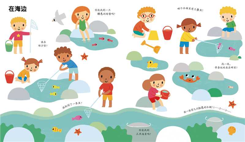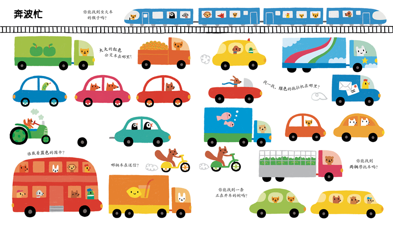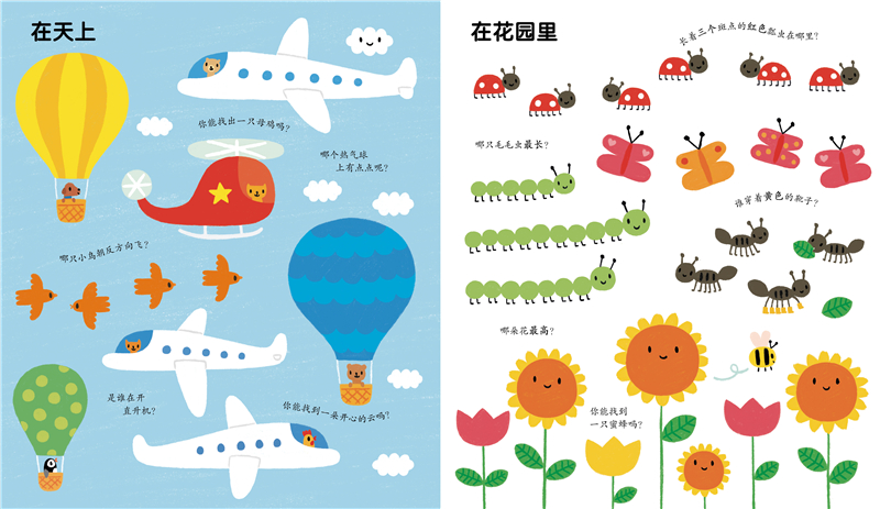 这是一套合适1-4岁小朋友阅读的专注力养成启蒙认知游戏书。本册以热闹的户外为主题,包含有趣的集市、在花园里、在农场、去购物、森林踏青、在海边等18个户外常见场景,每页设计亲子互动问题,让小朋友们动脑想一想,动手找一找、数一数: