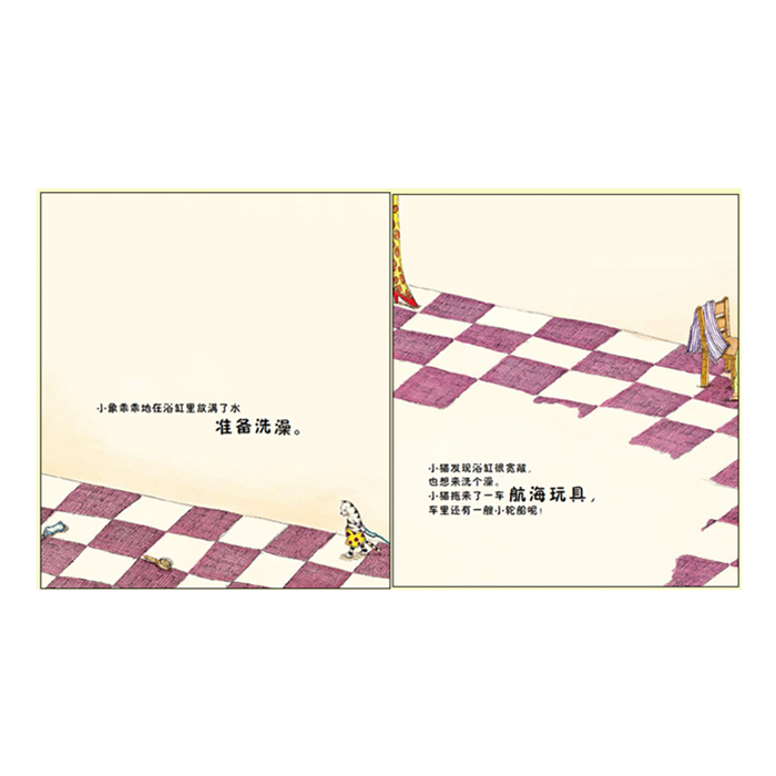 洗澡的时间到了,小朋友和大象一起来洗澡吧!大象的浴缸实在太大了,小猫咪、小兔子、长颈鹿、小熊……小伙伴们一个接一个地爬了进来,可以出海远航了!可是,这个时候一个问题出现了,浴缸里的水哪儿去了?