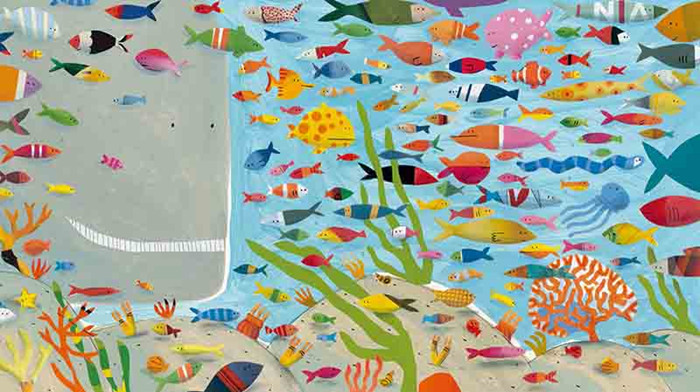 请问,在五彩斑斓的海洋生物里,一只黄色的小海星在哪里?一只蓝色的小水母呢?还有一条红色的小丑鱼又在哪里?