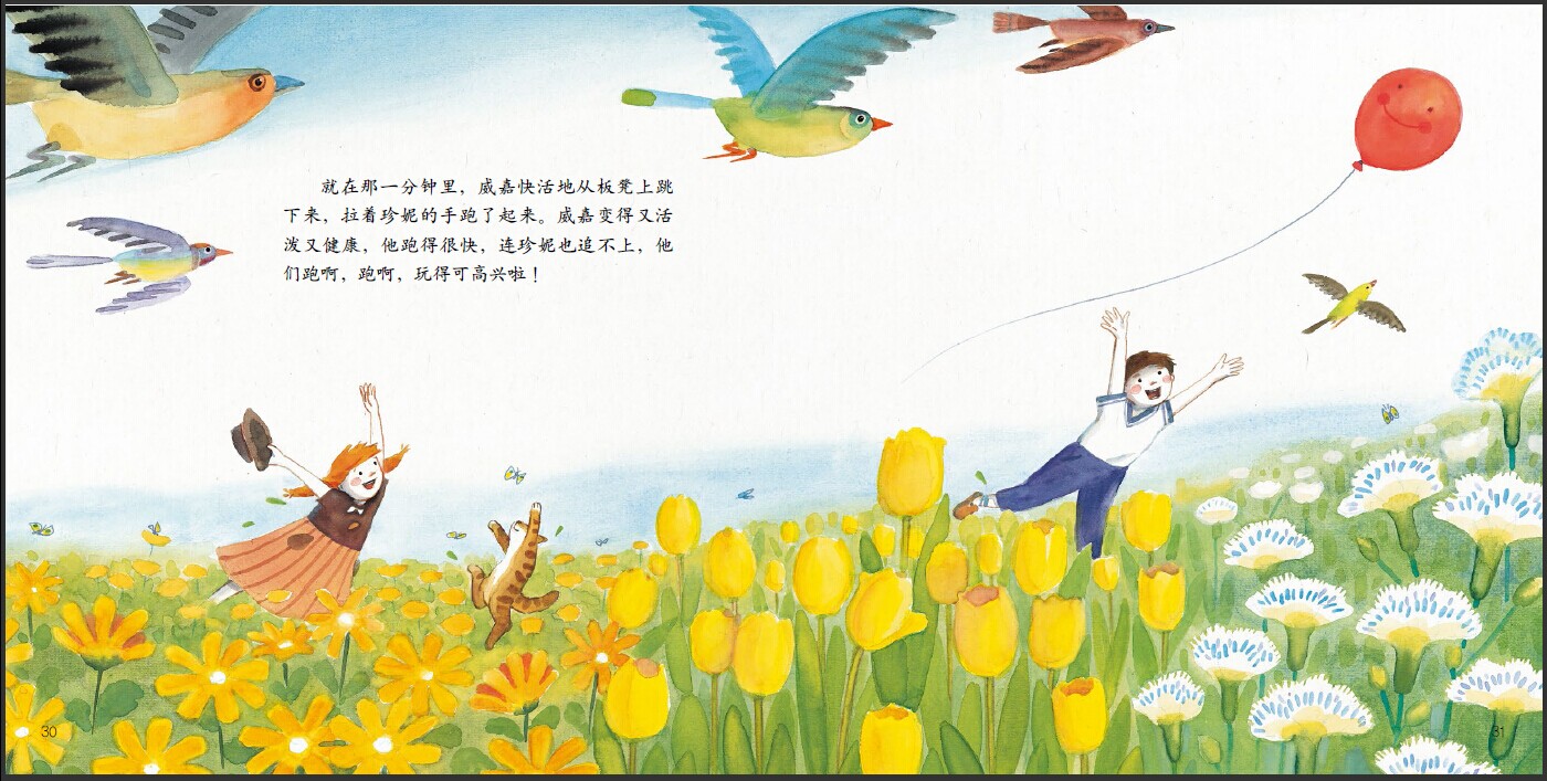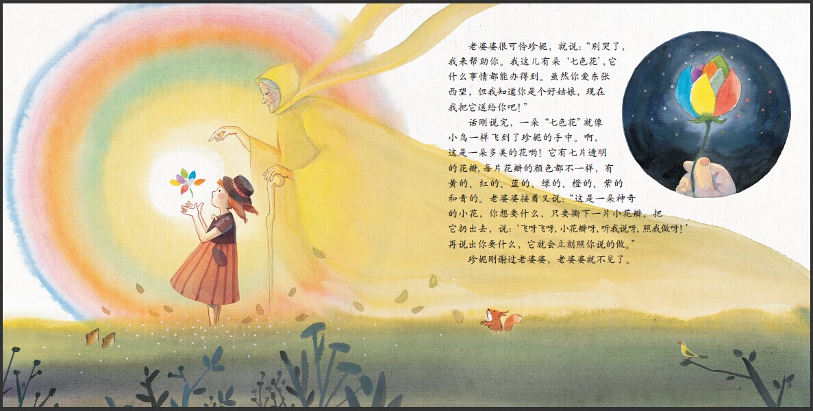珍妮得到了一朵有魔力的小花,珍妮用其中的六片花瓣,满足了她所有的欲望,可是她并不开心。最后一片花瓣,珍妮满怀着爱帮助了一个陌生的男孩,同时获得的还有快乐。