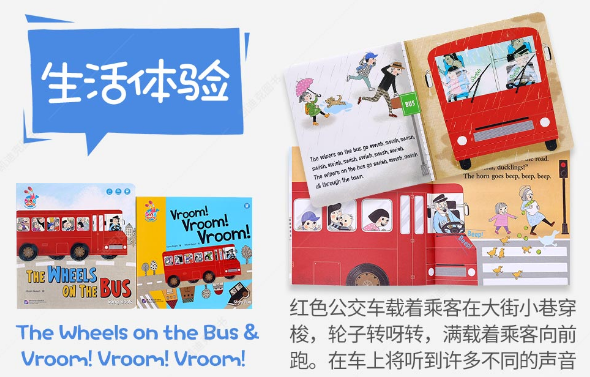 红色公交车载着乘客在大街小巷穿梭,轮子转呀转,满载着乘客向前跑。在车上将听到许多不同的声音。