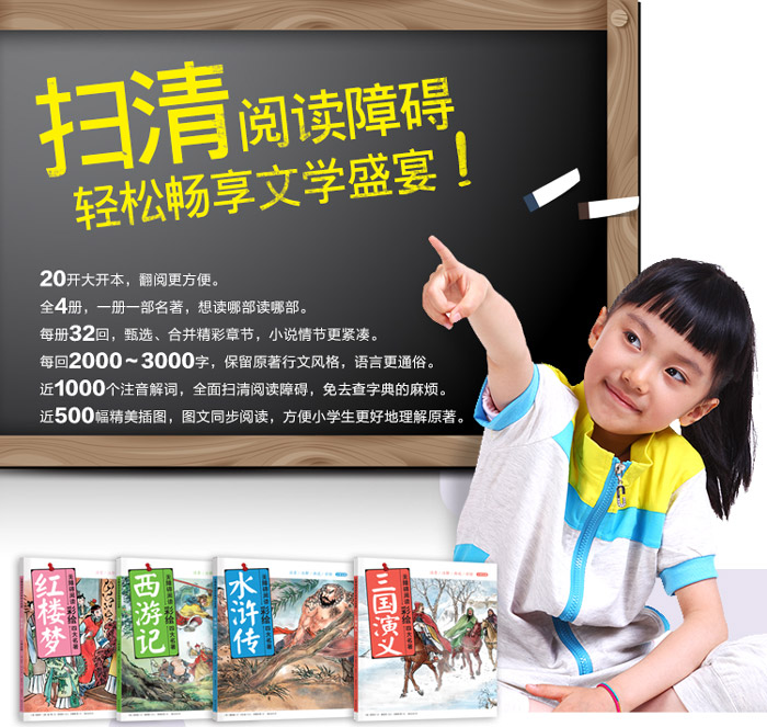 无障碍阅读彩绘四大名著(小学生版)(全4册)图文互动、注音解词——全面扫清阅读障碍。专为小学生打造的四大名著“悦”读版!20开大开本,翻阅更方便。全4册,一册一部名著,想读哪部读哪部。每册32回,甄选、合并精彩章节,小说情节更紧凑。每回2000~3000字,保留原著行文风格,语言更通俗。近1000个注音解词,全面扫清阅读障碍,免去查字典的麻烦。近500幅精美插图,图文同步阅读,方便小学生更好地理解原著。