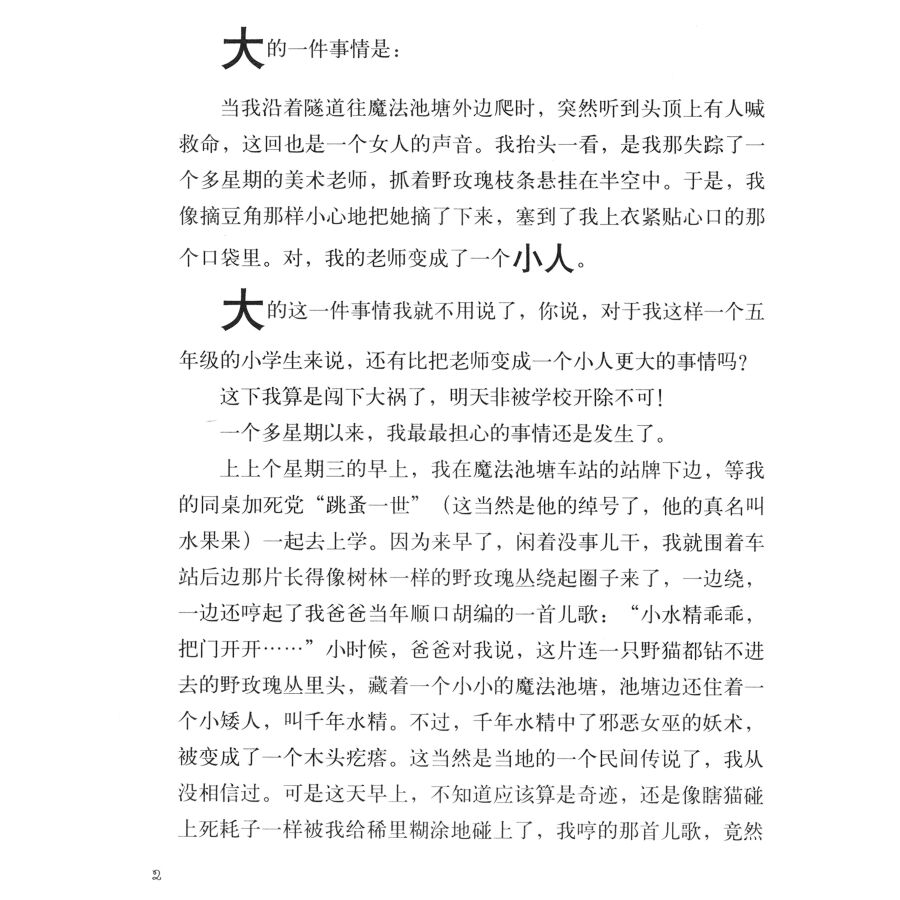 天哪,我、我的美术老师虎姑婆被变成了一个8.3厘米高的小人!不是我施的魔法,是魔法池塘里的千年水精干的,而且他还告诉我,虎姑婆不是人类,原本就是一个小人。没办法,我只好把她装进衬衫口袋里,偷偷地带回家,承担起一个小人守护者的职责。太惊险了,她先是差一点被我妈当成一只小老鼠扔掉不说,还被我的班主任给没收了……不过,直到最后我才知道,她原来是某一个国度的公主,再过几天,就会有一只金黄色的巨鸟降落到一片海滩,来接她返回故乡。