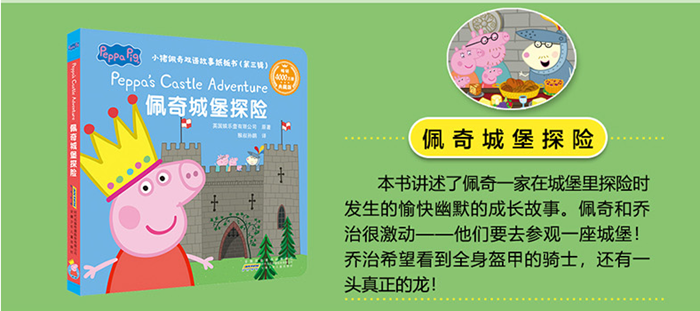《小猪佩奇双语故事纸板书(第三辑)·佩奇城堡探险》:本书讲述了佩奇一家在城堡里探险时发生的愉快幽默的成长故事。佩奇和乔治很激动——他们要去参观一座城堡!乔治希望看到全身盔甲的骑士,还有一头真正的龙!