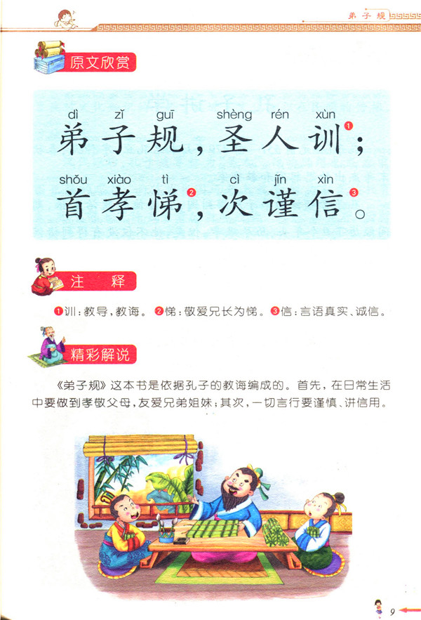 《弟子规》这本书是依据孔子的教诲编成的。首先,在曰常生活中要做到孝敬父母,友爱兄弟姐妹;其次,一切言行要谨慎、讲信用。