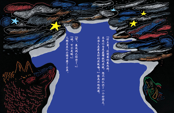 一个狂风暴雨的晚上,一头山羊和一匹野狼,阴差阳错地一起在破屋内避雨,由于天黑,看不清对方的样子,因而错认对方为同类。在这个恐怖又无聊的晚上,两者竟谈得异常投机,不但结为朋友,还相约改天再会,届时会发生什么事呢?真是第一流的布局。