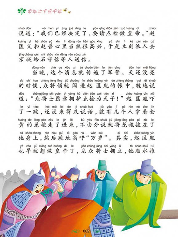 本书运用充满童真童趣的语言,以图文结合、文字注音的方式,总体按照历史编年的顺序,讲述了杯酒释兵权、李元昊建西夏、完颜阿骨打建金、绍兴和议等40余篇我国宋辽金时期的有名历史故事。全书图画明快活泼,大字拼音,有声朗诵,适合儿童阅读需求,是向少年儿童传播传统历史文化的读物