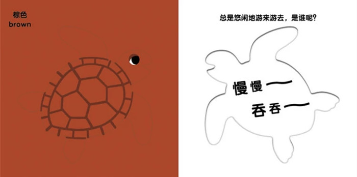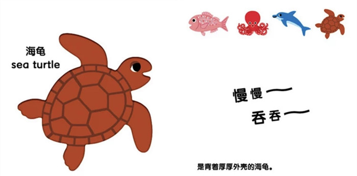“鳞片会发光,是谁呢?”“闪闪亮亮”“是欢快地游来游去的鱼。”有趣的文字游戏,鲜艳的色彩,帮助婴幼儿在游戏中认识常见的海洋动物。结合挖洞翻页的触觉体验,将图形与知识融合,培养幼儿形象思维能力。 “粉色,pink”,“鳞片会发光,是谁呢?”“闪闪亮亮”“是欢快地游来游去的鱼”“鱼,fish”。 在游戏中不仅可以认知红色(red)、蓝色(blue)、棕色(brown)各种颜色名称及英文,还可以认知章鱼(octopus)、海豚(dolphin)、海龟(sea turtle)等常见的可爱海洋动物、英文拼写,以及各自的特征。