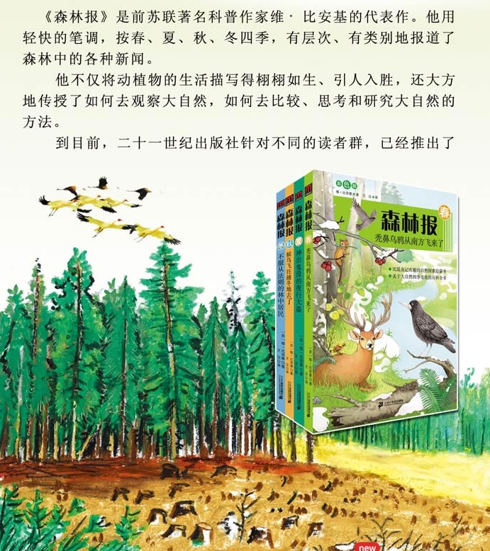 这部名著是苏联著名科普作家维·比安基的代表作。著者以其擅长描写动植物生活的艺术才能,用轻快的笔调、采用报刊形式,按春、夏、秋、冬四季12个月,有层次、有类别地报道森林中的新闻,森林中愉快的节日和可悲的事件,森林中的英雄和强盗,将动植物的生活表现得栩栩如生,引人入胜。著者还告诉了孩子们应如何去观察大自然,如何去比较、思考和研究大自然的方法。