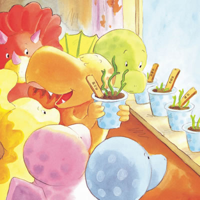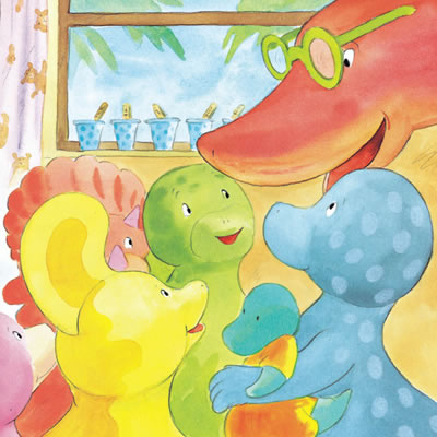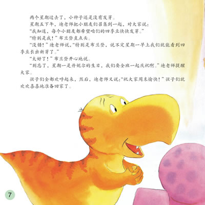 值得注意的是,在系列图画书中,作者有意轻描淡写爸爸妈妈的形象,真正的主人公只有一群可爱小恐龙和他们和蔼、睿智的迪老师。这正是系列图画书的独具智慧之处:帮助我们的孩子在离开爸爸妈妈的时候,学会自己解决问题,培养真正独立的人格、积极的心态和快乐的心情。