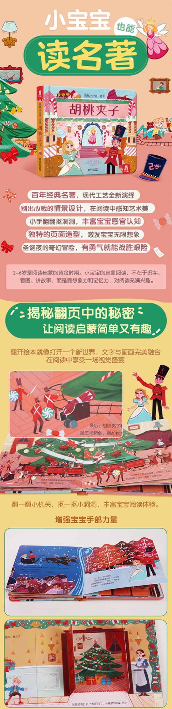 玛丽在圣诞前夜收到了一个特别的玩具——胡桃夹子。午夜,玛丽看见胡桃夹子带领着其他玩具同老鼠打仗。胡桃夹子被老鼠咬住,玛丽脱下自己的鞋子甩向鼠王,把鼠群赶散。胡桃夹子为了感谢玛丽,邀请她到糖果王国参加圣诞舞会。本书运用精巧的翻翻、洞洞设计,将经典世界名著故事演绎成一幕幕真实的舞台剧,让孩子直接走进名著,在互动阅读中亲近、了解名著,体验主人公的喜怒哀乐。