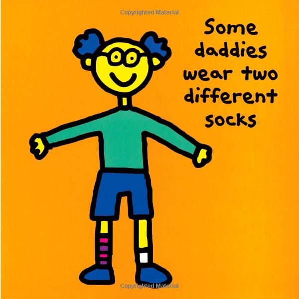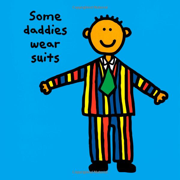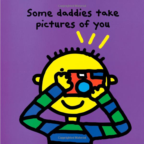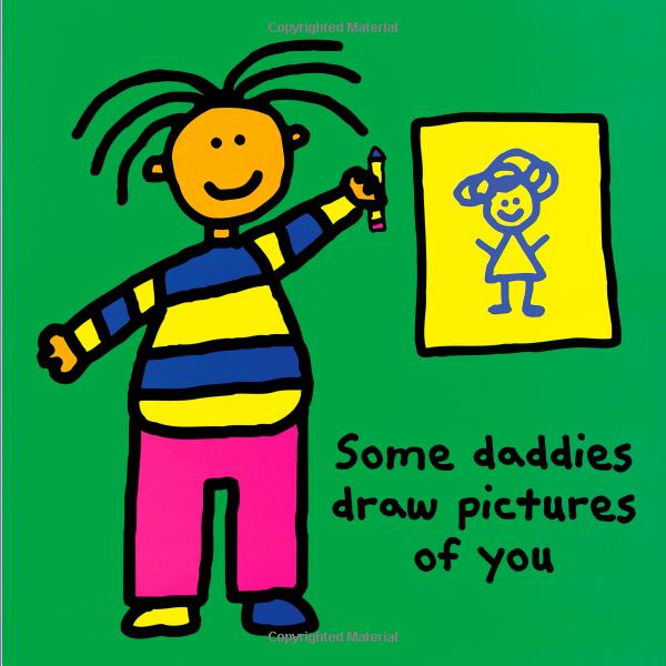 A board book edition of a popular picture book portrays a variety of fathers, some with lots of hair and little hair, making cookies and buying doughnuts, camping out and taking naps, and hugging and kissing their children.