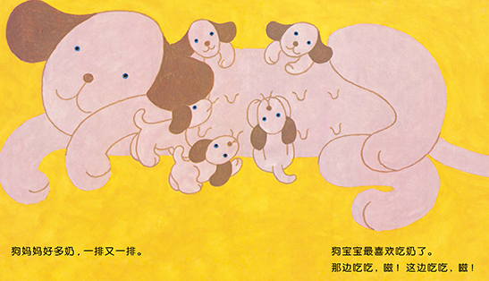 《妈妈的奶》:妈妈的奶,好暖好圆啊!嗞嗞,吃吃这边,嗞嗞,吃吃那边,不给爸爸吃!牛妈妈的奶,好大好丰满,你喝牛奶,我也喝!小宝宝、小猴子、猪宝宝、熊宝宝、狗宝宝、牛宝宝、鲸鱼宝宝,一个个咕嘟咕嘟使劲儿吃奶,都快快长大吧……