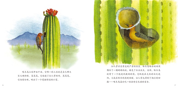 本书语言优美平实,图画灿烂热烈,真实地呈现了壮美的沙漠景观。仙人掌的生命历程充满艰辛,却又令人着迷和敬畏。自然界里的生命网复杂交织,而我们又何尝不是如此?相信这本意境深远的书能在每个孩子心中引发感动与思考。