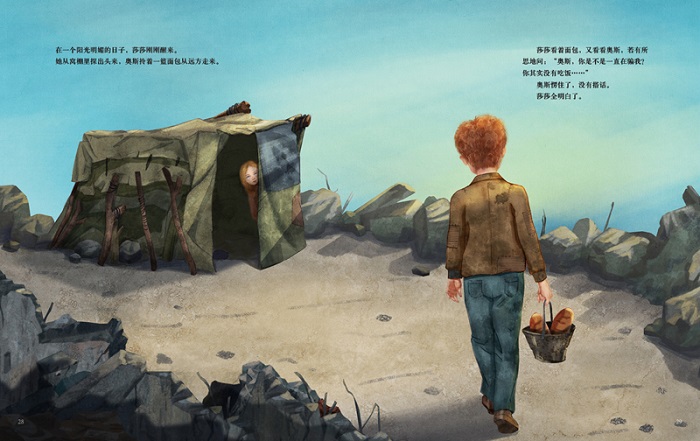 战火打破了一座小城的平静,也让小女孩儿莎莎的生活天翻地覆。莎莎的爸爸牺牲在战场,妈妈为了保护她而死去。曾经幸福快乐的“小公主”莎莎成了孤儿,和小男孩儿奥斯一起在满目疮痍的街头流浪。绘本从儿童的视的视角看待无情的战争,表现了战争给人们带来的苦难,以及和平生活的弥足珍贵,培养爱国主义精神和家国情怀。