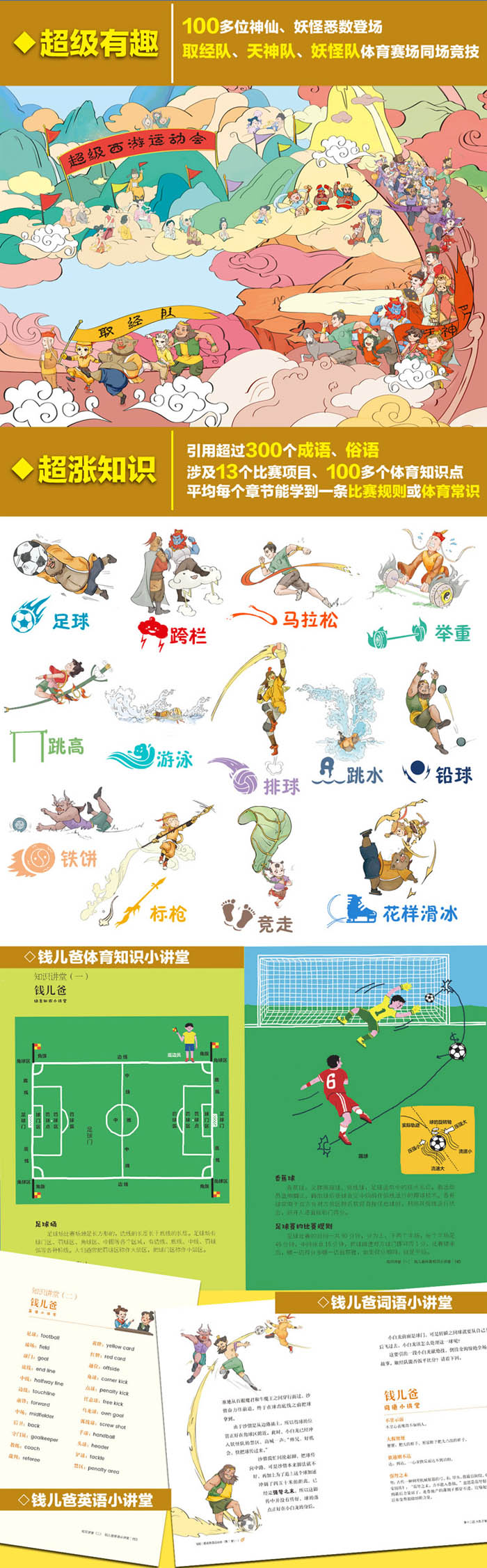 《超级西游运动会(第1 季)》共有6 册,是语言艺术家韩涛(钱儿爸)创作的以《西游记》中人物为主要角色的体育运动小说,讲述唐僧师徒踏上体育赛场的精彩故事。唐僧师徒组成取经队,天宫和龙宫诸神仙组成天神队,大大小小的妖怪们组成妖怪队,三支队伍摒弃前嫌,共赴公平公正、专业而严谨的超级西游运动盛会。在本册故事中,三支队伍在跳水、铅球、铁饼、标枪四项比赛中展开了金牌争夺战。想知道吗?大块头的八戒练习跳水,会水淹全城吗?手无缚鸡之力的唐僧,推得动铅球吗?